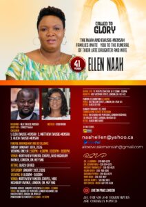 Ellen Naah, of London ON, passed away peacefully at Victoria Hospital on Friday January 9th 2026, in her 41st year. Beloved wife of Alex Ewusie-Mensah. Loving Mother of Elsa, Matthew and Alicia Ewusie-Mensah. Dear daughter of Lydia Naah and the late Augustine Naah. Loved granddaughter of Thomas Zingsung and the late Jacqueline Pogpila. Beloved sister of Ernest Naah. Niece of Dr. Isaac Luginaah, Noella Luginaah, Dr Mary Margaret Taabazuing and Steve Abuoro-Docta. Dear cousins of Anthony and Numa Luginaah and Jude and Joshua Abuoro-Docta.